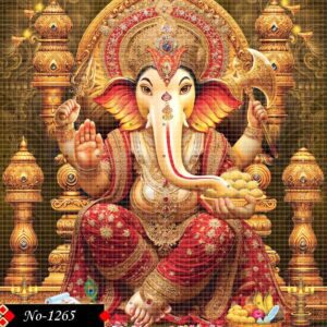 Divine idol of Lord Ganesha seated majestically in a traditional temple setting. Lord Ganesha is in a blessing posture with one hand raised in Abhaya Mudra. A bright backdrop with gold archways. The overall color theme includes rich reds, glowing golds. Highly detailed and spiritual aesthetic.