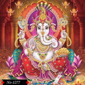 This resplendent artwork showcases Lord Ganesha seated majestically on a lotus, adorned in intricate red and purple attire with pearl and gem embellishments. Set against a rich magenta backdrop framed in gold and brown.