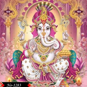 This resplendent artwork showcases Lord Ganesha seated majestically on a lotus, adorned in intricate white and pink attire with pearl and gem embellishments. Set against a rich magenta backdrop framed in gold, Ganesha exudes purity and grace.