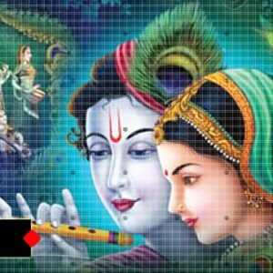 A devotional poster featuring Radha and Krishna in a moment of bliss. 90