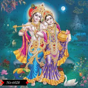Both adorned in intricate golden jewelry that sparkles with devotion. A majestic swan rests at their feet, adding nature’s harmony.