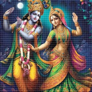 This sacred poster showcases Radha and Krishna’s celestial presence.