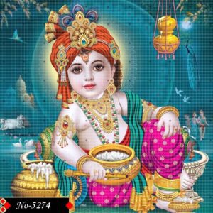 A heart-melting portrait of Baby Krishna resting gracefully . His eyes radiate innocence, his flute cradled gently in hand. Gold jewelry and floral adornments add divine charm. A heavenly glow surrounds the lush background.