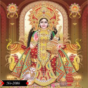 Goddess Lakshmi is seated on a throne. She is draped in an elegant saree .