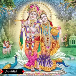 Two peacocks rests gracefully near their feet, adding grace to the divine scene. The detailed embroidery on their attire shines with spiritual elegance.