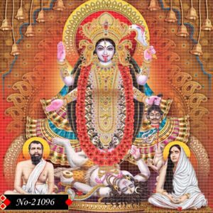 A spiritual masterpiece where Ramakrishna and Sarada Devi appear bathed in a golden aura. Behind them, the powerful form of Goddess Kali glows, filling the composition with divine warmth and sacred reverence.