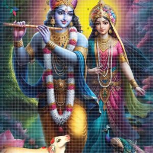 A spiritually rich poster showing Radha and Krishna in divine embrace.