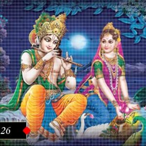 A spiritually rich poster showing Radha and Krishna in divine embrace.