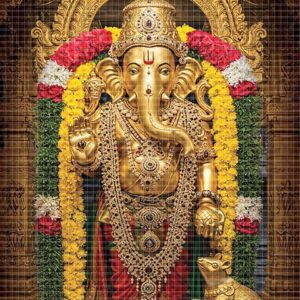 Lord Ganesha is beautifully dressed with traditional embellishments.