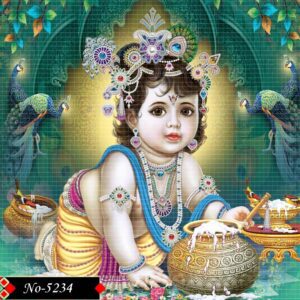 Adorable depiction of baby Krishna is shown sitting near a pot of butter (Makhan), joyfully indulging in his favorite treat. His facial expression is playful and divine.