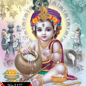 A divine digital artwork of child Lord Krishna, radiating innocence and celestial charm. His adorable face glows with a divine smile, capturing hearts with every glance.