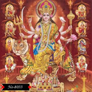 Seated upon a majestic tiger, Ambaji Maa radiates unmatched spiritual power. Her golden crown sparkles with jewels, symbolizing her supreme authority. Each arm carries a weapon gifted by the gods for her battle against Mahishasura. Her gaze is serene, filled with compassion for her devotees. The backdrop is adorned with soft golden light and the figures of her nine divine forms.