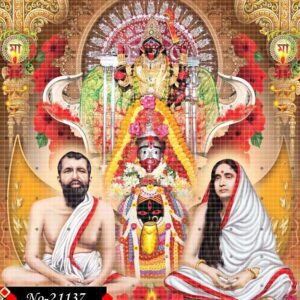 An aura of divinity surrounds Sri Ramakrishna and Sarada Devi, while the glowing figure of Goddess Kali rises in the backdrop. The entire composition is a testament to spiritual strength, devotion, and divine connection.