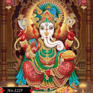 A highly detailed and divine painting of Lord Ganesha with a peaceful expression, sitting gracefully, glowing spiritual aura, intricate background with trees and mist, traditional Indian artistic style.