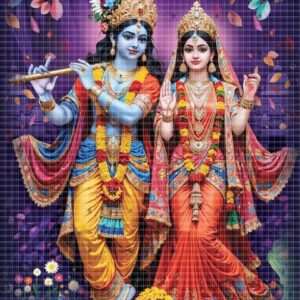 This artistic poster brings alive the divine embrace of Radha and Krishna.