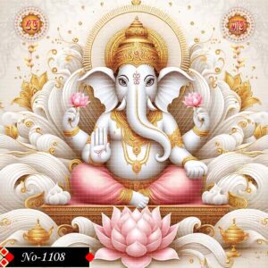 This artistic depiction features Lord Ganesha, the Hindu god of beginnings and remover of obstacles, seated serenely on a lotus. His gentle gaze, the symbolic gestures of his hands, and the overall serene and ornate details evoke a sense of peace and auspiciousness. 1