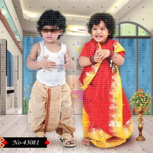 Two sweet babies, a boy and a girl, are shown in this heart-warming image. The boy’s smiling face spreads happiness, while the girl’s big, curious eyes look enchanting. Their Indian attire makes them look even more delightful and culturally elegant.