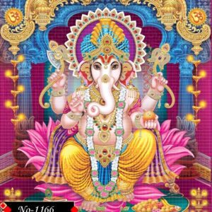 Ganesha is adorned in a bright yellow dhoti with blue and gold accents, seated on a pink lotus with a serene expression. The style is vibrant and highly decorative, with intricate gold jewelry and a colorful crown. The background features an ornate archway in shades of blue and gold against a pink backdrop, with auspicious symbols and offerings including fruits at the bottom.