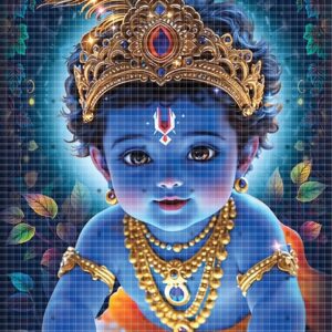 A blissful poster of Bal Krishna, glowing with divine innocence. His joyful eyes and vibrant look spread calmness, purity, and sacred beauty to the surroundings.
