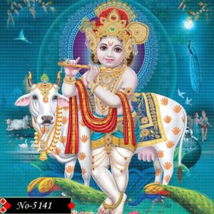 A breathtaking representation of Lord Krishna’s mythological grandeur in standing posture with Gomaata (cow) – divine light surrounds his form, rich in color and sacred symbolism.