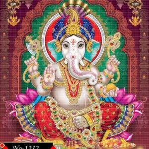 The artwork is adorned with intricate gold jewelry, vibrant gemstones, and rich textures. Ganesha is shown with four arms holding traditional symbols.