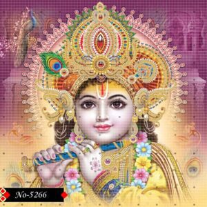 The image shows Krishna playing a flute. He is depicted with glowing soft blue skin, wearing a golden crown adorned with a peacock feather, and dressed in angavastram. He is also wearing various golden ornaments like necklaces, earrings, and armbands.