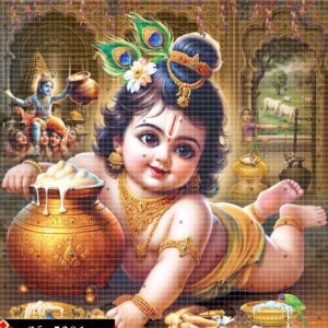 This image depicts a charming illustration of Little Krishna, adorned with traditional jewelry and a peacock feather in his hair.
