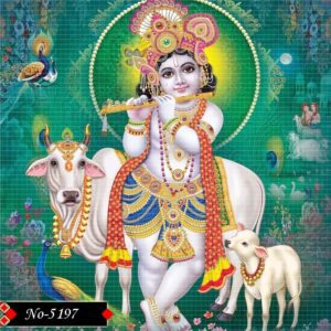 Lord Krishna standing in a relaxed posture beside his beloved sacred cows. The colorful background and divine glow reflect a perfect harmony of nature, childhood, and divinity.