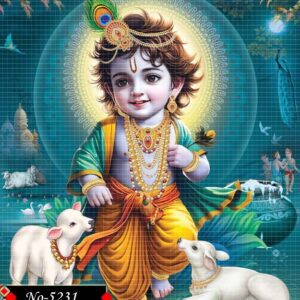 This mythological digital masterpiece portrays young Krishna in a standing posture, exuding a heavenly aura. His glowing skin, dazzling ornaments, and richly colored clothing create a sacred visual that awakens devotion and inner calm.