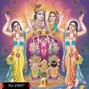 This devotional piece reflects the blissful energy of Gour and Nitai’s sacred dance. Surrounded by the divine figures of Radha-Krishna and Jagannath’s trinity, the image becomes a celebration of bhakti, divine presence, and eternal peace.