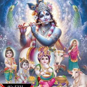 This vibrant digital artwork beautifully blends multiple divine representations form of Lord Krishna. Lord Krishna at various stages—child Krishna eating butter, Krishna with Radha, and playful moments from his early life with cows and companions. The image is rich in colors and intricate details, with a deeply spiritual and mythological ambiance. Each element reflects divine grace, devotion, and the timeless stories of Sanatan Dharma.