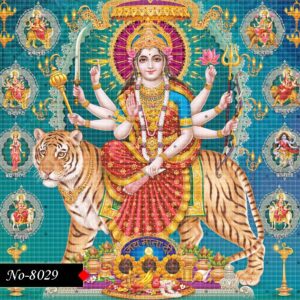This illustration of Goddess Ambaji shows her enthroned on a majestic tiger with divine elegance. Each of her eightarms carries a symbol of divine justice and prosperity. The background is adorned with soft hues and floral patterns, enhancing the image’s tranquility. Her divine aura fills the space with holiness. This image embodies spiritual protection and maternal love.