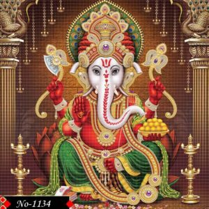 This vibrant artwork portrays Lord Ganesha seated in a divine and regal posture, exuding blessings and spiritual grace. He is richly adorned in a red and green ensemble, embellished with intricate gold jewelry and a magnificent crown encrusted with gems. Holding a lotus, an axe, a modak plate, and a noose, Ganesha symbolizes purity, strength, prosperity, and protection. The background is ornately decorated with hanging golden lamps, twin peacocks, and carved pillars, enhancing the grandeur and sanctity of the composition. This divine image beautifully embodies wisdom, auspiciousness, and devotion.
