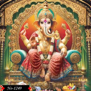This elegant depiction of Lord Ganesha presents Him in a serene beige and brown palette, seated gracefully. Adorned with intricate jewelry and a regal golden crown, He holds traditional symbols of wisdom, power, and prosperity. The background features subtle spiritual motifs, enhancing the divine and peaceful aura of the artwork.
