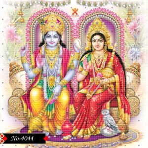 This divine image depicts the perfect harmony between protection and prosperity through the eternal presence of Lord Vishnu and Goddess Lakshmi. Lord Vishnu, the preserver of the universe, radiates strength and calm, while Lakshmi, seated gracefully, represents divine abundance. Together, they echo the message of balance in worldly and spiritual pursuits. Their presence is a blessing to seekers of truth and harmony.