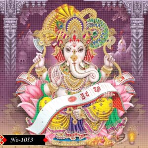This vibrant and intricately detailed artwork depicts Lord Ganesha seated majestically on a lotus, adorned in rich, traditional attire with elaborate jewelry and a radiant crown. Surrounded by divine symbols and auspicious elements, He holds sacred objects in His hands, symbolizing wisdom, prosperity, and protection. The background features a temple-like setting, enhancing the spiritual ambiance. Perfect for religious posters, textile prints, and devotional art collections.