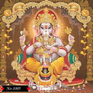 This magnificent artwork showcases Lord Ganesha in a regal posture, seated on an ornate golden throne, radiating divine energy and wisdom. Surrounded by glowing lamps and intricate golden architecture, he holds sacred symbols representing power, prosperity, and protection. At the forefront, a beautifully adorned Shiva Lingam signifies the deep spiritual connection between Lord Ganesha and Lord Shiva, symbolizing devotion, blessings, and cosmic balance.