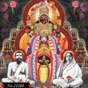 A divine vision unfolds with Sri Ramakrishna and Sarada Devi at the forefront, their expressions serene and enlightened. Goddess Kali radiates power and purity in the backdrop, bathing the scene in sacred light and divine energy.