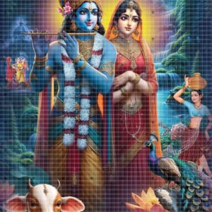 A divine poster capturing Radha and Krishna in eternal union.