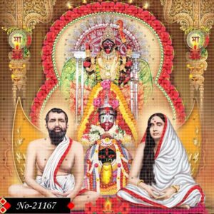 The image shows Sri Ramakrishna and Sarada Devi glowing with divine wisdom, while the mighty Goddess Kali blesses from above. A masterpiece that reflects devotion, inner light, and sacred presence.