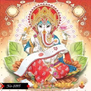 A divine and serene depiction of Lord Ganesha seated on a blooming lotus, holding a lotus flower, a sweet, and a sacred scroll. Adorned in majestic red and blue attire with a radiant golden crown, this artwork reflects purity, grace, and spiritual wisdom. A perfect symbol of prosperity and devotion, ideal for sanctifying any space with blessings and positivity.