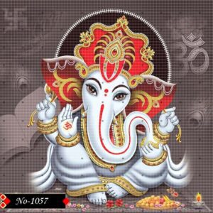 This serene and minimalistic depiction features a white-hued Lord Ganesha radiating calm and purity. Accentuated by a striking red and gold halo, Ganesha is adorned with delicate jewelry and holds his symbolic items — a lotus, modaks, and an ankush — while blessing devotees with a graceful mudra. The subtle gray background with sacred ‘Om’ motifs adds to the spiritual ambiance, making this an ideal design for modern devotional artwork and spiritual interiors.