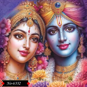 This enchanting artwork portrays the divine faces of Radha and Krishna. Their eyes radiate love, serenity, and deep spiritual connection. Radha’s glowing face is adorned with golden jewelry and delicate flowers. Krishna’s blue complexion shines with grace, complemented by his majestic crown. Both wear garlands of fragrant white flowers and golden ornaments. Vibrant lotuses bloom at the bottom, symbolizing purity and devotion. The background glows with purple and pink hues, enhancing their divine aura. This image captures the eternal bond of Radha-Krishna’s love.