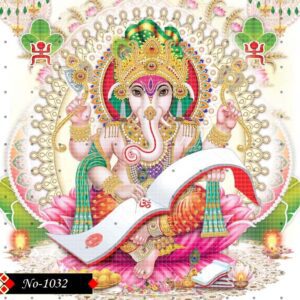 Showcases a luminous depiction of Lord Ganesha seated gracefully on a blooming lotus, holding a sacred scripture. Surrounded by a radiant halo and adorned in a richly detailed crown and ornaments, this divine form emphasizes wisdom, learning, and spiritual guidance. With vibrant hues of red, green, and gold, the artwork highlights Ganesha’s role as the remover of obstacles and the patron of intellect. The presence of scriptures and books further enhances the spiritual and educational essence of this elegant and devotional piece.