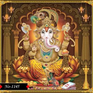 This elegant image presents Lord Ganesha seated in a richly adorned golden temple, exuding wisdom and divinity. Dressed in radiant yellow attire with intricate ornaments, he holds symbolic objects that bless devotees with success and protection. The presence of a lotus throne, traditional lamps, and offerings completes this spiritually vibrant portrayal.