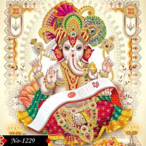 Lord Ganesha in a grand and colorful traditional Indian style, seated on a lotus, adorned with heavy ornamental jewelry and a majestic multicolored crown, holding a feathered pen and scroll with sacred scripts, intricate embroidery patterns, glowing diya lamps, surrounded by vibrant motifs, auspicious symbols like “ॐ” and “शुभ लाभ”, traditional offering plate with fruits and sweets, light background with rich decorative borders, divine and vibrant composition.