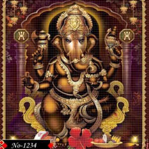 This powerful depiction of Lord Ganesha showcases him seated regally against a richly detailed dark brown temple backdrop, symbolizing strength and guardianship.