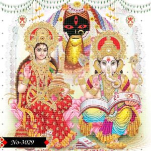 The image is a vibrant and detailed depiction of Hindu deities, likely a devotional print or calendar art. In the center, a dark-skinned, four-armed goddess, Mata Kali, is depicted with red eyes and an open mouth, adorned with garlands and surrounded by an arch-like structure. Below her, to the left, sits a fair-skinned goddess, likely Lakshmi or Saraswati, richly adorned and holding a musical instrument (possibly a veena), seated on a lotus. To her right, the elephant-headed god Ganesha is seated, holding various objects and an open book. The overall composition is colorful and intricate, with decorative elements, offerings, and floral arrangements, creating a sense of reverence and festivity.