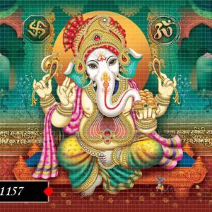 Ganesha is depicted with a red and gold patterned headdress and a green and yellow dhoti, seated in a relaxed posture on an ornate throne. His expression is peaceful, and he holds symbolic items including sweets, rendered in a vibrant and colorful style. The background features a blend of teal and orange hues with auspicious symbols, text in Devanagari script, and stylized depictions of lingams.