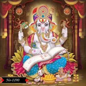 Ganesha is depicted with a colorful crown and a vibrant blue and pink patterned dhoti, seated on a stylized lotus while writing on a scroll. His expression is focused and serene, rendered in a highly ornate and colorful style with intricate gold jewelry. The background features a warm, glowing arched alcove with ornate golden pillars and auspicious symbols. Offerings including sweets and a small mouse figure are placed at the bottom.